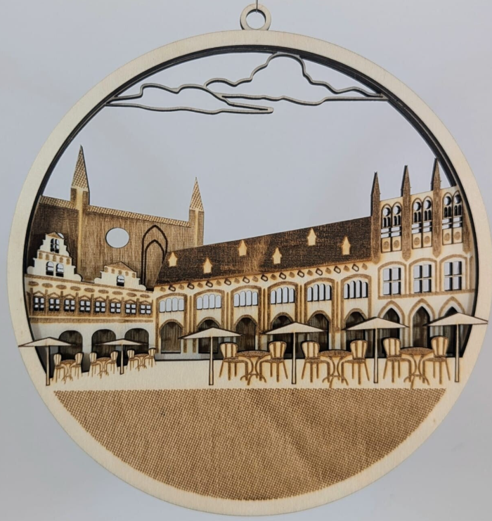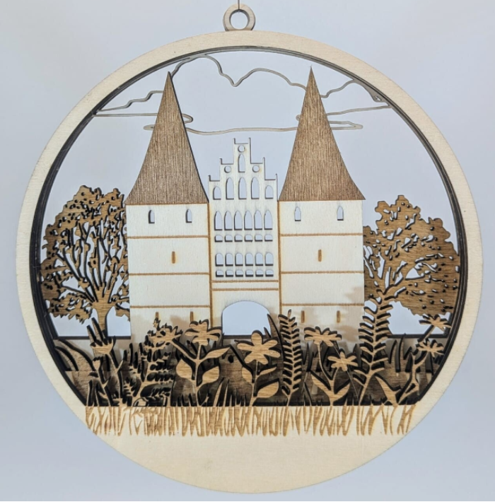 Fensterbilder aus Holz mit Lübeck-Motiven zeigen Sehenswürdigkeiten wie das Holstentor und die Altstadt. Sie sind  ideal als Dekoration oder Souvenir.